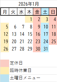 1月1日(木・祝)、1月3日(土)、1月5日(月)、1月12日(月)、1月19日(月)、1月26日(月)