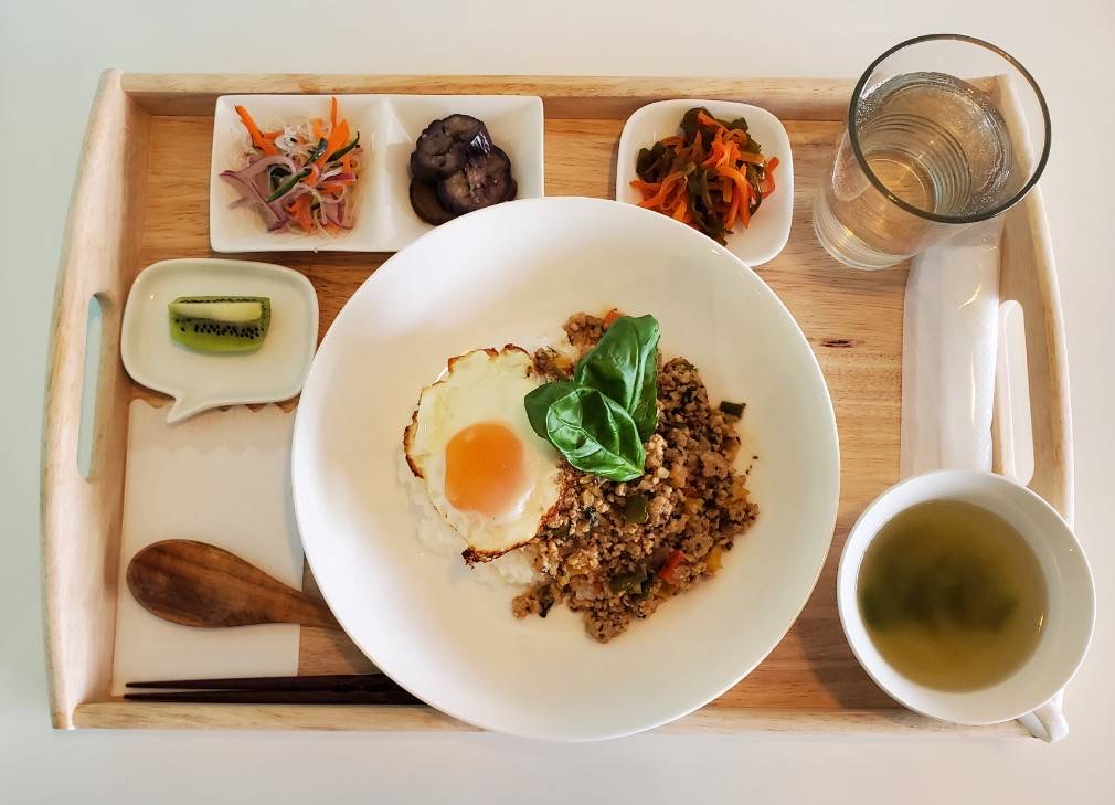 これまでのメニューメニュー 2月12日のランチメニュー これまでのメニュー 2026.02.12 ガパオライス ヤムウンセン(タイ風春雨サラダ) 人参とピーマンのきんぴら 茄子の和え物 セロリのスープ キウイ テイクアウトの場合は下画像のようになります ぜひお越しください