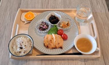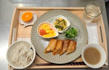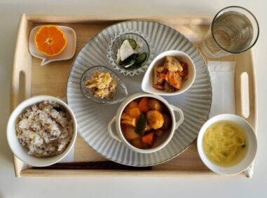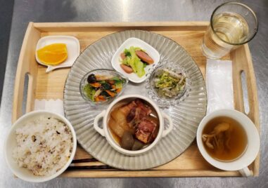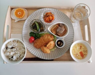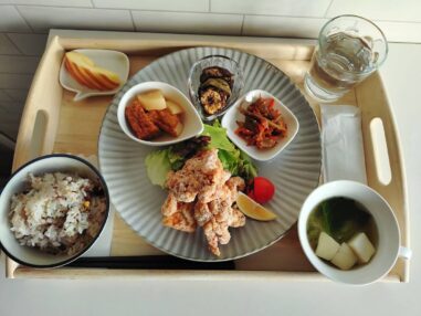 鶏の唐揚げ 金平牛蒡 厚揚げと大根の煮物 茄子の焼きびたし 味噌汁(小松菜・はんぺん) ごはん(雑穀米) りんご テイクアウトの場合は下画像のようになります