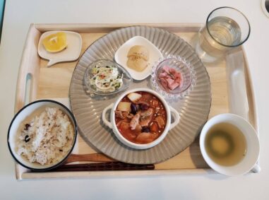 チキンのクリーム煮 きのこのマリネ トマトとほうれん草とベーコンの炒めもの コールスローサラダ ワカメスープ ごはん(雑穀米) キウイ テイクアウトの場合は下画像のようになります ぜひお越しください