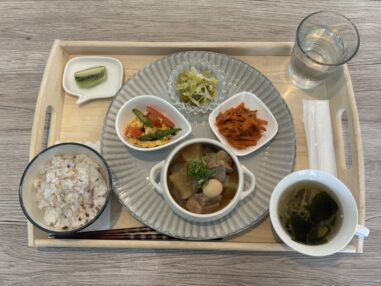 ガーリック醤油チキン ひじきの煮物 胡瓜とワカメの酢の物 厚揚げと白菜のうま煮 小松菜のお味噌汁 ごはん(雑穀米) オレンジ テイクアウトの場合は下画像のようになります ぜひお越しください